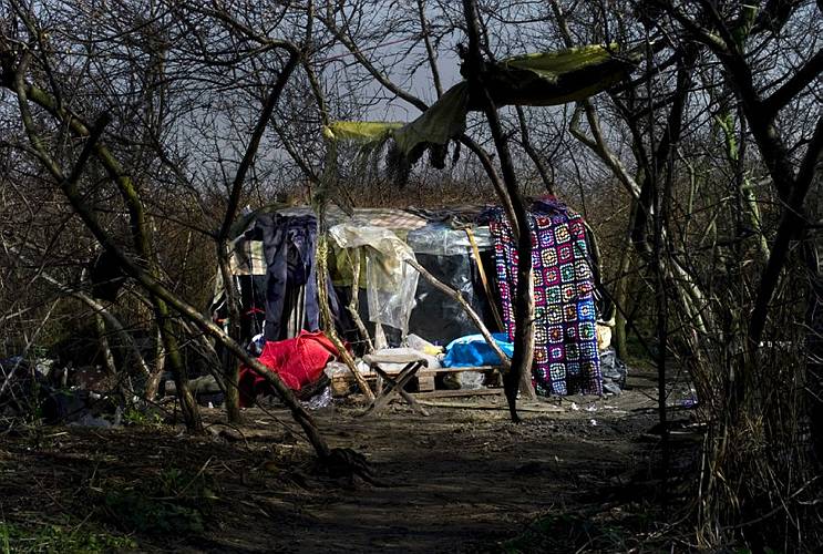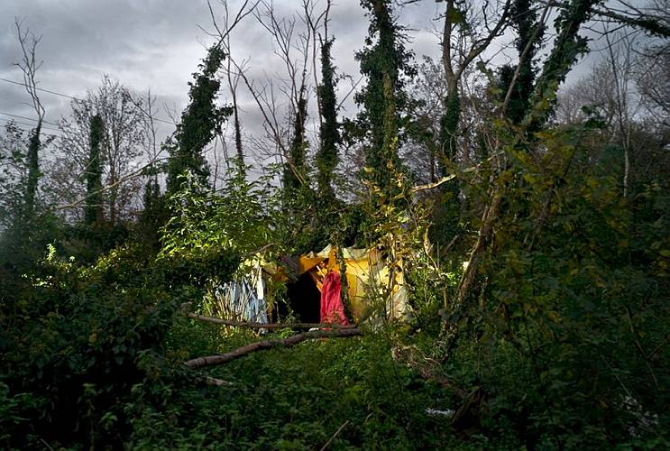 Le «giungle di Calais» sono dei resti di sottobosco, spinosi e scarni, sul margine di questa piccola città del nord della Francia, con un campanile e un porto. Calais è una città ai bordi del canale e del tunnel sotto la Manica. Vi si spalanca la via verso l’Inghilterra e pertanto la città risucchia i migranti clandestini: negli anni 1990, Croati, Bosniaci e Kosovari. In seguito: Afghani, Curdi, Irakeni, Iraniani, Pakistani, Somali, Etiopi... Essi sono alla fine del loro viaggio e alla fine della loro corsa. Gli abitanti di Calais li considerano come dei «poveri disgraziati». Alcune associazioni locali, come La Belle Etoile, C’sur, Salam, e Le Secours Catholique vengono loro in aiuto. A Sangatte, nel 1999, un capannone in disuso del cantiere del tunnel sotto la Manica viene convertito in centro di accoglienza per rifugiati. Un immenso salone senza pareti divisorie, con tende distribuite dalla Croce Rossa e dall’HCR (High Commissioner for Refugees), dà ricovero agli 800 migranti che trascinano le loro illusioni nella regione. Oggi il traffico è in aumento, tanto che 1500 migranti aspettano pazientemente tra Dunkerque e Cherbourg, a Calais, St-Georges-sur-Las, Loone-Plage, Grande-Sainte, Teteghem, Wisques, Norrent-Fontes, Angres, Steenvoorde e Steenwerck. Ma Calais resta il punto strategico di passaggio e questi migranti, per la maggior parte giovani uomini, si arenano nelle giungle a tre chilometri dal centro della città, occupando abusivamente dei pezzi di terreno boscoso, accanto alla fabbrica chimica, vicino all’autostrada e in riva al mare. Angoli abbandonati dove neanche i cani vanno a pisciare. Si nascondono in capanne dissimulate tra le macchie boschive. Da tre a dieci giovani per ogni tugurio. Hanno tra i 10 e i 25 anni. Da tre giorni a cinque mesi di attesa prima di riuscire a passare. Perché bisogna trovare il camion che va in Inghilterra e non in Belgio. Inoltre bisogna pagare i traghettatori che controllano i parcheggi. Da tre giorni a cinque mesi schivando le retate della polizia e la distruzione periodica delle giungle, operata con mezzi cingolati. Da tre giorni a cinque mesi per avere la meglio su una potente organizzazione anti-migratoria: 12 milioni di euro all’anno per rendere sicuro il porto e risistemarlo con barriere e reticolati; 500 poliziotti adibiti esclusivamente a prevenire gli imbarchi clandestini. Ogni giorno vengono arrestati trenta migranti nella cinta della zona portuaria. Ogni settimana, tuttavia, un centinaio di loro riesce a raggiungere l’altra costa del canale. Quest’opera presenta un lavoro fotografico sulle capanne di Calais. È stato premiato nel 2008 con un World Press Photo, categoria «Problemi Contemporanei», ed uno Swiss Press, categoria «Estero». Queste fotografie mostrano le capanne senza i loro abitanti, i migranti. Dei pezzi di teloni, coperte o cartoni, assemblati alla meglio tra gli alberi. A mezza strada fra l’abisso e le illusioni. Queste fotografie dimostrano che la chiusura di Sangatte non ha cambiato nulla. Calais rimane sempre un punto strategico per la migrazione, semplicemente perché vi passano moltissimi camion. Niente è cambiato, tranne le violenze della polizia che sono aumentate; tranne le mafie dei traghettatori che vi sono sbarcati; tranne i migranti che stasera dormono all’aperto.